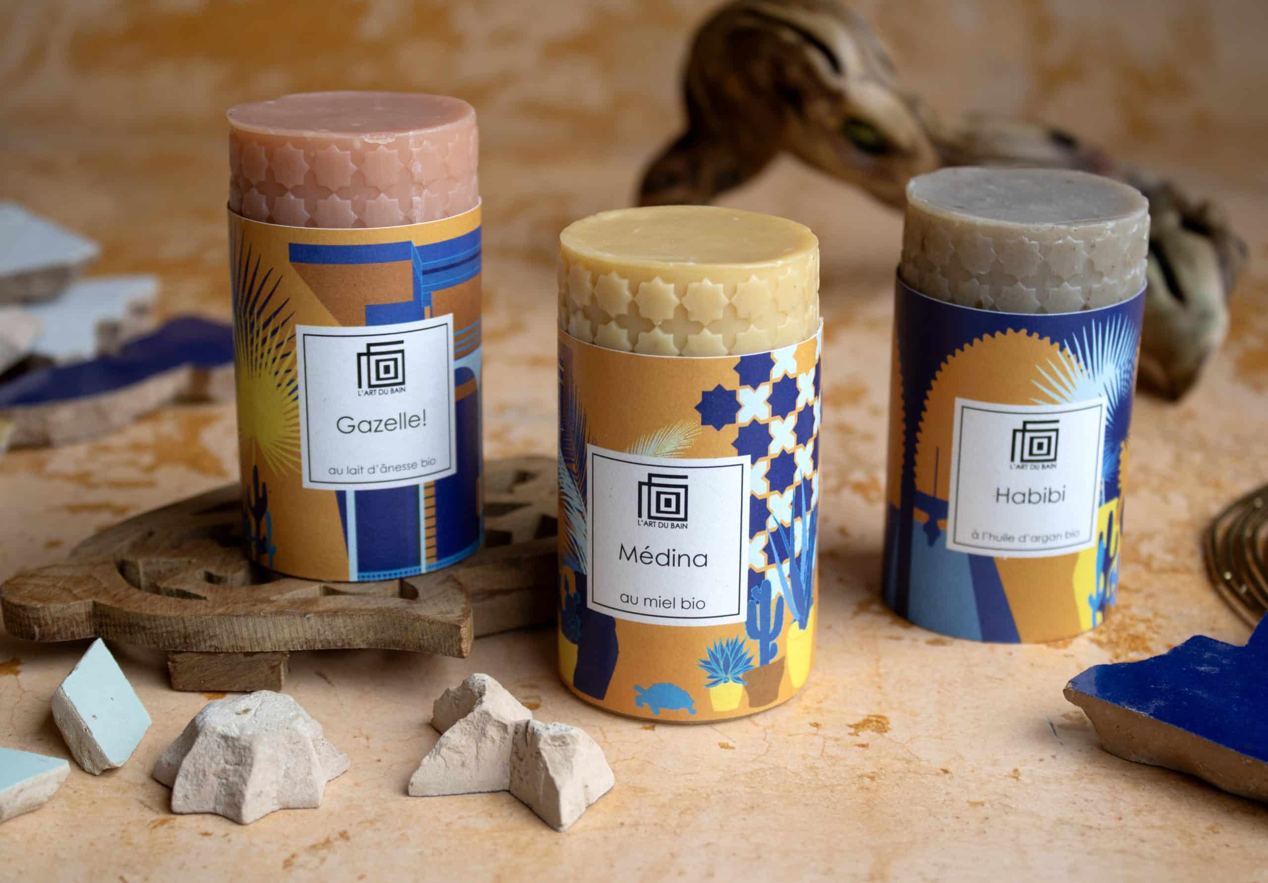 Nos savons qui vous emportent au loin. Du beurre de mangue, de l’huile d’argan ou du miel et des parfums enivrants pour un voyage vers l’Inde ou le Sahara, la jungle ou la palmeraie de Marrakech.